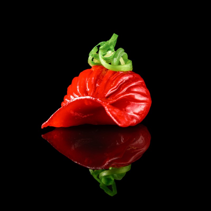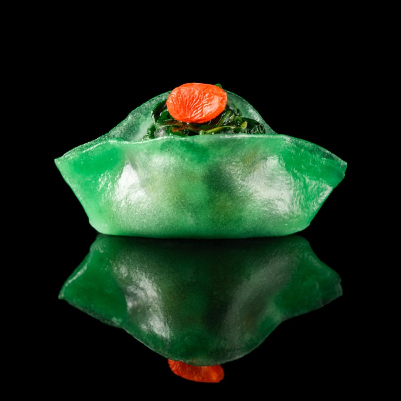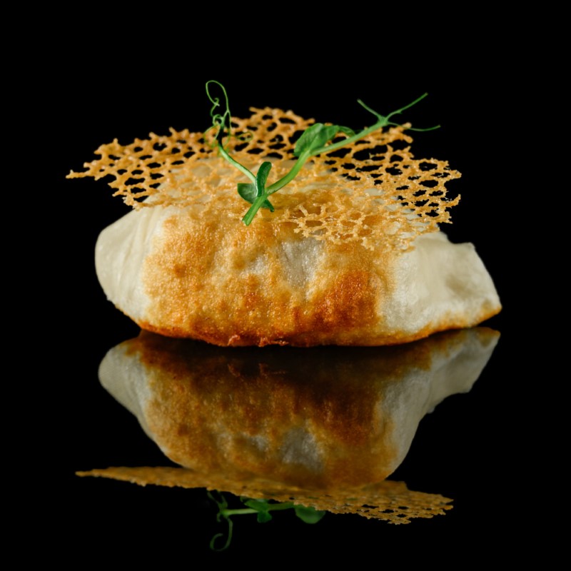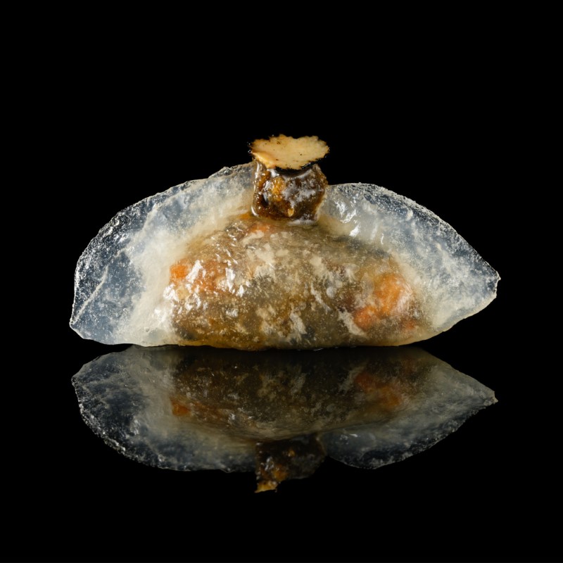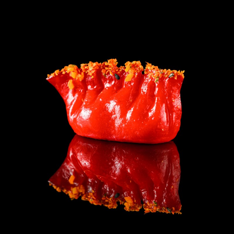 Savor the exquisite fusion of tender chicken, rich black garlic, and fiery chili oil in our Crystal Dumplings. Encased in orange colored wrappers, each bite bursts with savory and spicy flavors.