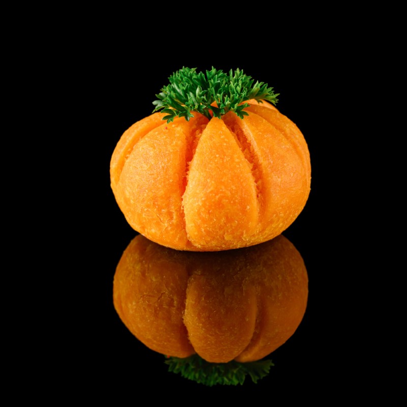 Indulge in our Curry Rabbit Pumpkin Puff. A dumpling shaped like a pumpkin, bursting with savory curry-infused rabbit filling and the sweetness of pumpkin, each bite offers a delightful contrast of flavors and textures.